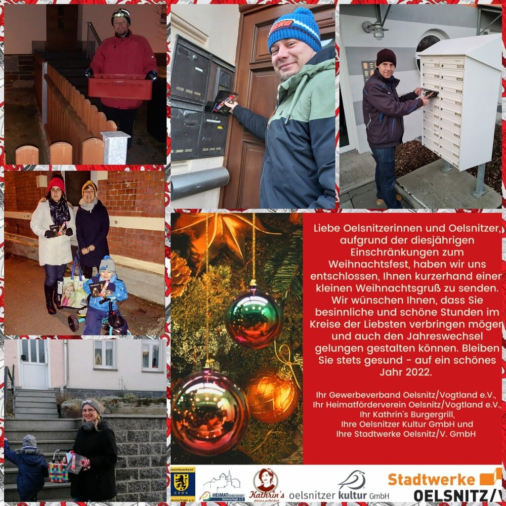 Da in diesem Jahr abermals alles vorweihnachtliche wie Weihnachtsmärkte, Weihnachtskonzerte und natürlich die Weihnachtsfeiern der Pandemie zum Opfer fiel, rief die Oelsnitzer Kultur GmbH zusammen mit dem Oelsnitzer Gewerbeverband den Oelsnitzer Stadtwerken, Kathrin's Bürgergrill sowie unserem Heimatfördervereindiese Aktion ins Leben.